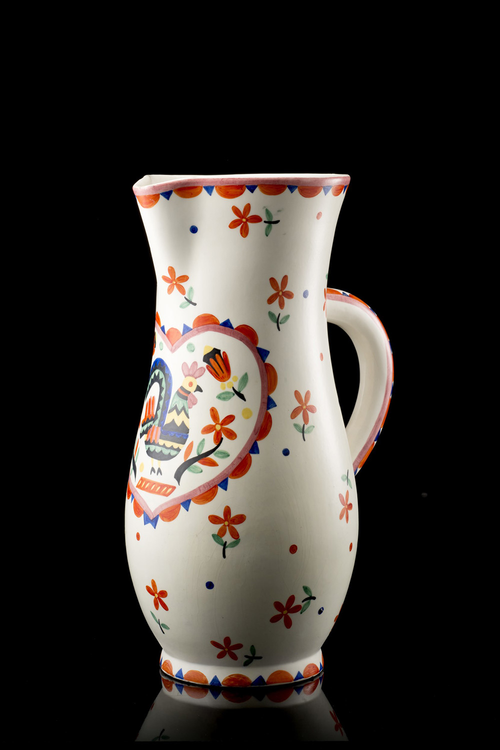 Brocca in ceramica formata a colaggio e dipinta in policromia. Torino, anni '30. Recante firma sotto la base "Lenci MADE IN ITALY" e iniziali del decoratore "LE". (h cm 34,5) (lievi difetti)