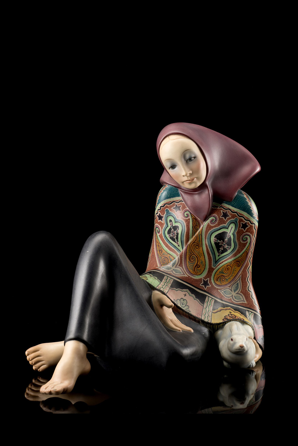 POLYCHROME OPAQUE CAST CERAMIC. Manufacture of Lenci, Turin, 1933ca. Signed at the base "Elena Scavini", signed under the base "Lenci ITALIA" and with the monogram of the decorator and "ARS LENCI" paper label. (41x35 cm.) (slight defects)