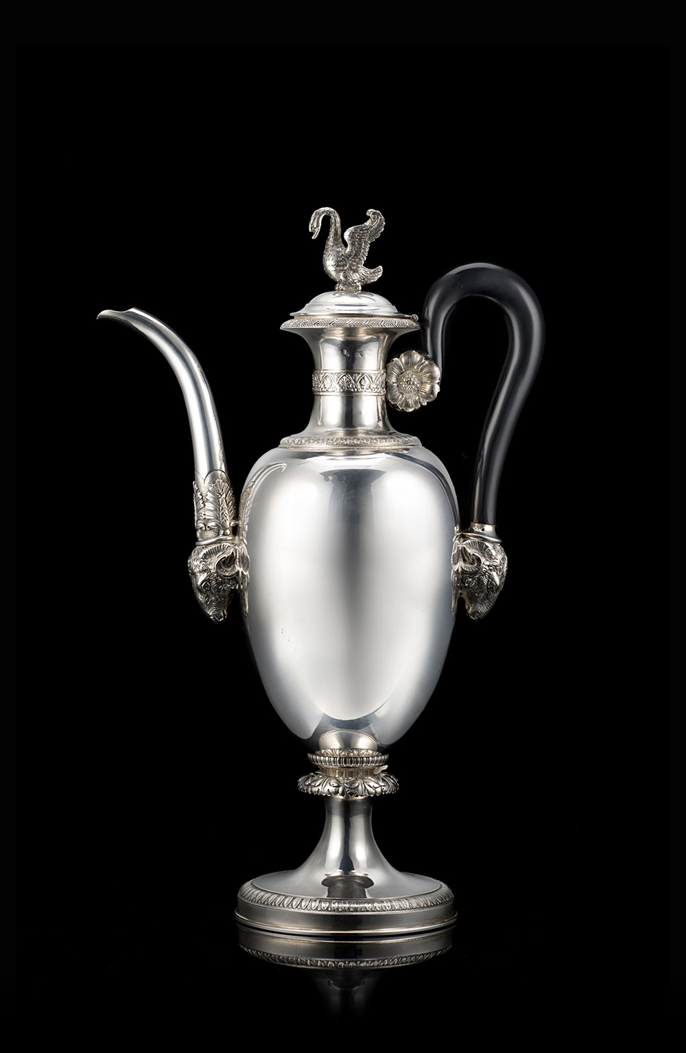 Caffettiera in argento con corpo ovoidale liscio decorato da cinture godronate, collarino fogliato ed attacchi a testa d’ariete; cimatura in figura di cigno a tutto tondo e manico ad ansa in legno ebanizzato. Bottega di Emanuele Caber, Milano 1812-1850 (h. cm 34 ca.) (g lordi 870 ca.) (lievi difetti)