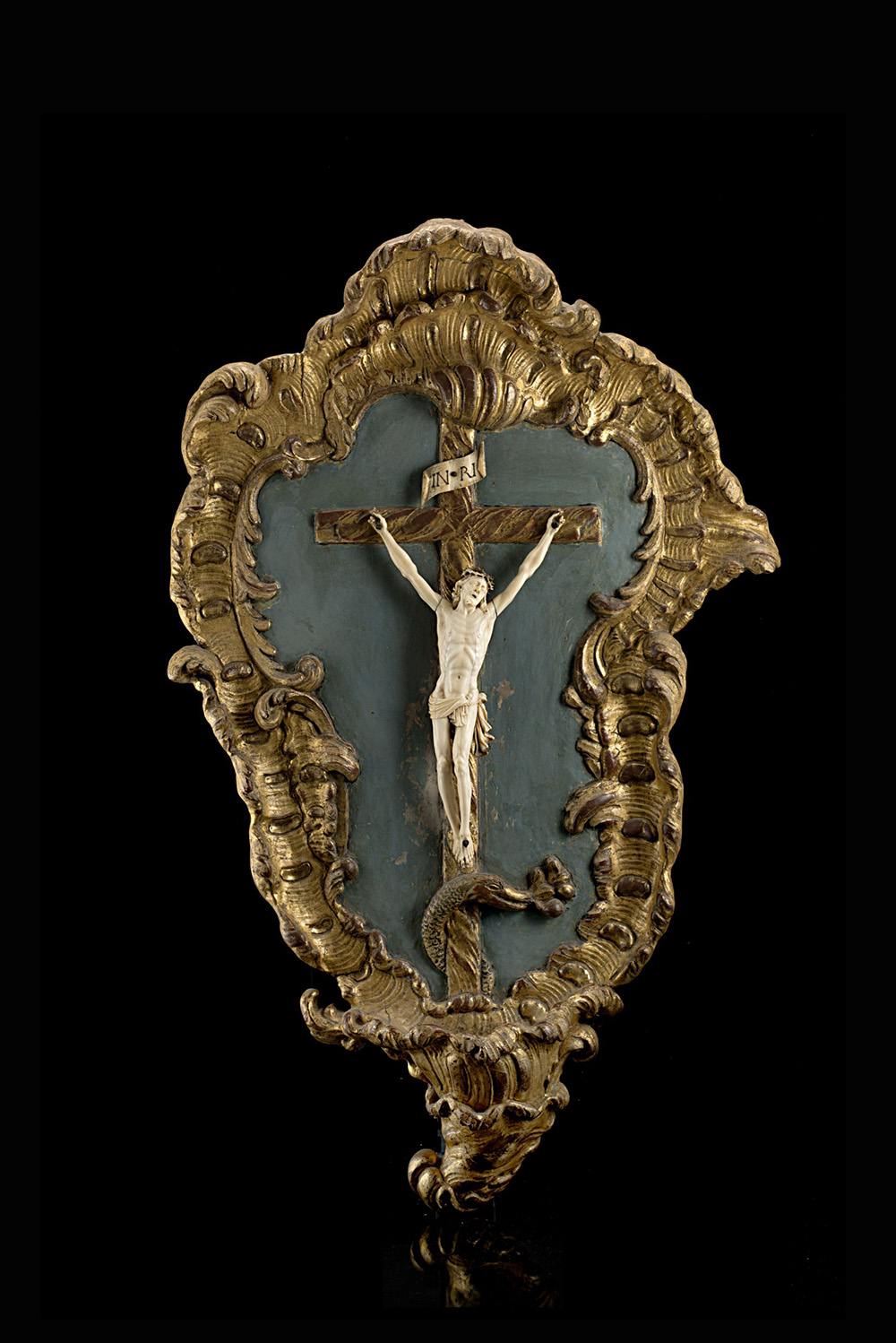 Arte dell'inizio del secolo XIX. Acquasantiera in legno intagliato e dorato a volute fogliate e serpente contenente un Cristo crocifisso in avorio scolpito a tutto tondo (cm 65x41) (lievi difetti e restauri)