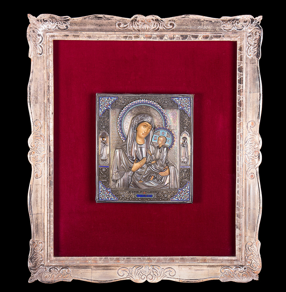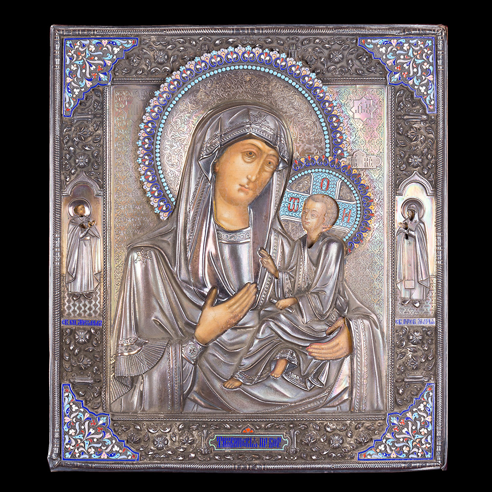 Icon depicting Madonna of Tikhvinskaya with silver riza and cloisonné enamels. Moscow, late 19th century, spurious marks of P. Ovchinnikov. In frame (cm 34x31) (defects)