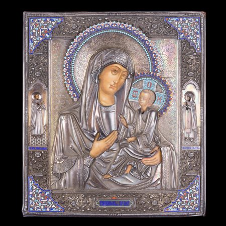 Icona raffigurante Madonna di Tikhvinskaya con riza in argento e smalti cloisonné. Mosca, fine secolo XIX, marchi di imitazione di P. Ovchinnikov. In cornice (cm 34x31) (difetti)