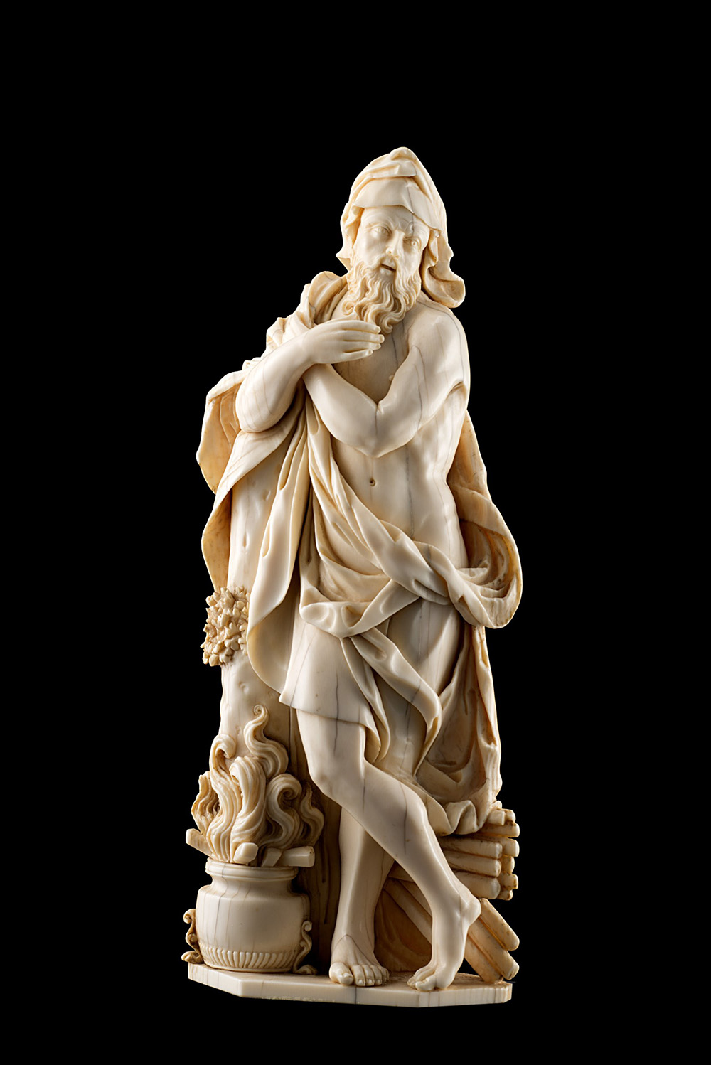 Artista nordico di ispirazione veneta "Allegoria dell'Inverno" scultura del secolo XVIII in avorio a tutto tondo poggiante su base in plexiglass a plinto (h. cm 17)