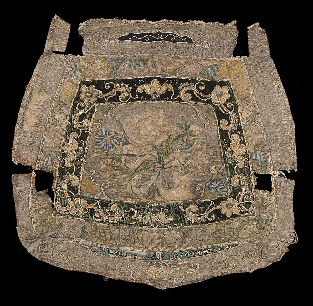 Lavorate in tessuto broccato in argento con ricami di mazzi floreali policromi, a piccolo punto, incorniciati da una bordura in velluto di seta verde inglese con applicazioni in seta e filo d'argento raffiguranti volute con fiori. (varie misure) (difetti e mancanze)