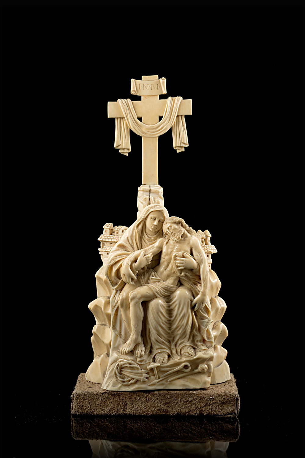 Artista tedesco, secolo XVI. Gruppo scultoreo in avorio raffigurante Cristo deposto con paesaggio e Croce sullo sfondo (h. cm 25) Siglato e datato AD 1523 al retro (difetti e sostituzioni)