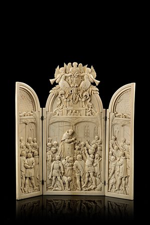 19th-century English artist. An ivory travelling triptych carved with an episode from the Counter-Reformation (cm 30x27) Inscribed on reverse. Case of a later date (defects)