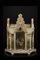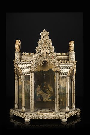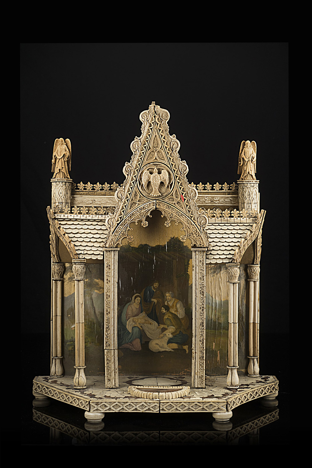 Antico modello di tempio gotico in legno e avorio con colonne e architravi scolpite a motivi ornamentali, montanti terminanti a figure di angeli intagliati a tutto tondo. Fondo in legno dipinto con Adorazione dei pastori in un paesaggio. Base di forma sagomata lastronata a finta tartaruga poggiante su quattro piedi torniti e scanalati (cm 43x50x22) (mancanze e restauri)