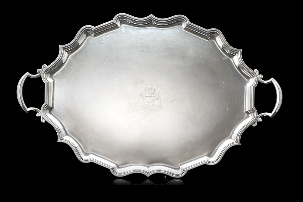 Vassoio in argento, a due manici, di forma ovale mistilineo con fondo liscio inciso da stemma e bordura modanata. Birmingham, 1906, Elkington and Co (cm 67,5) (g 4660 ca.) (lievi difetti)