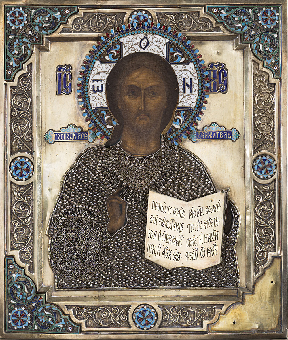 Icon depicting Christ blessing with riza in silver and enamels. European/Russian manufacture, 20th century. Spurious marks of Grachev (cm 32x27 ca.) (defects)