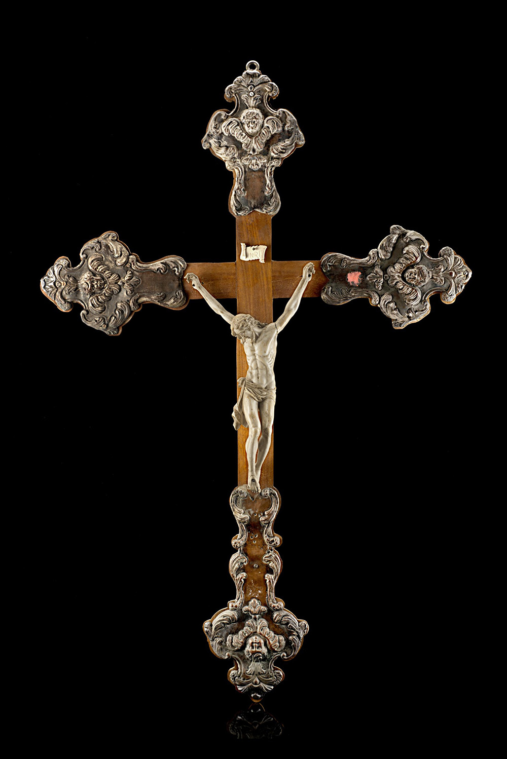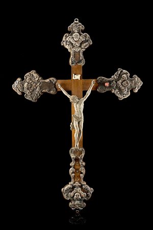 Putrino, secolo XIX "Cristo crocifisso" scultura in avorio con croce in legno e puntali in rame sbalzato e argentato. Firmato (h. cm 25) (lievi difetti)