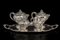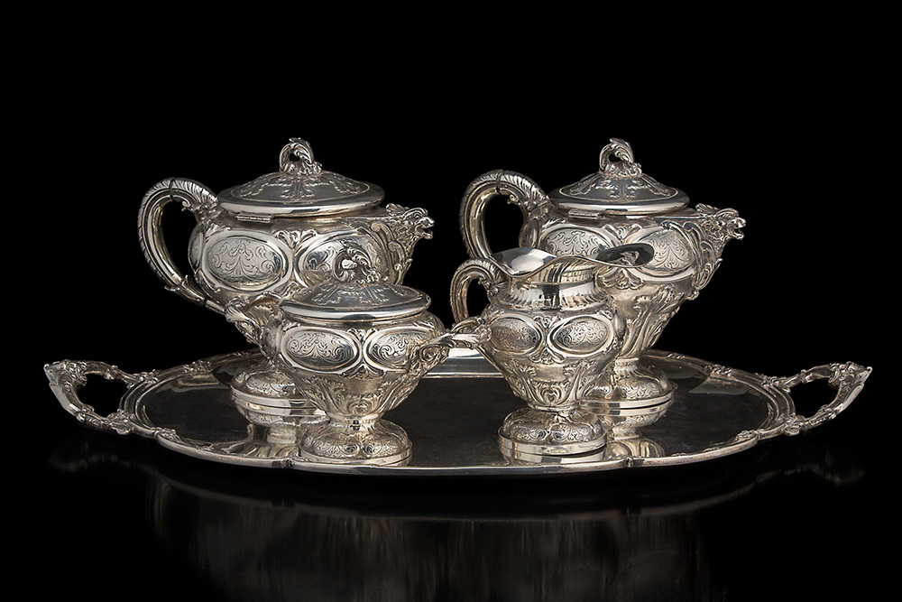 Servizio da tè e caffè in argento composto da caffettiera, teiera, zuccheriera, lattiera e vassoio di forma ovale sagomata; corpi globulari baccellati decorati da motivi floreali su fondo zigrinato; beccucci zoomorfi, manici ad ansa e cimature a volute fogliate.