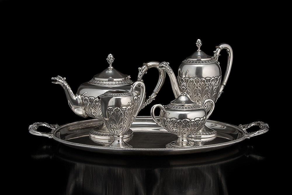 Servizio da tè e caffè in argento composto da caffettiera, teiera, zuccheriera e lattiera, con corpi ovoidali e bombati, decorati da fasce di foglie, e versatoi zoomorfi a collo di cigno; unito a vassoio ovale a due manici. Italia, metà secolo XX (h. max cm 21 ca.; vassoio cm 50x31,5 ca.) (g tot 2500 ca) (difetti)