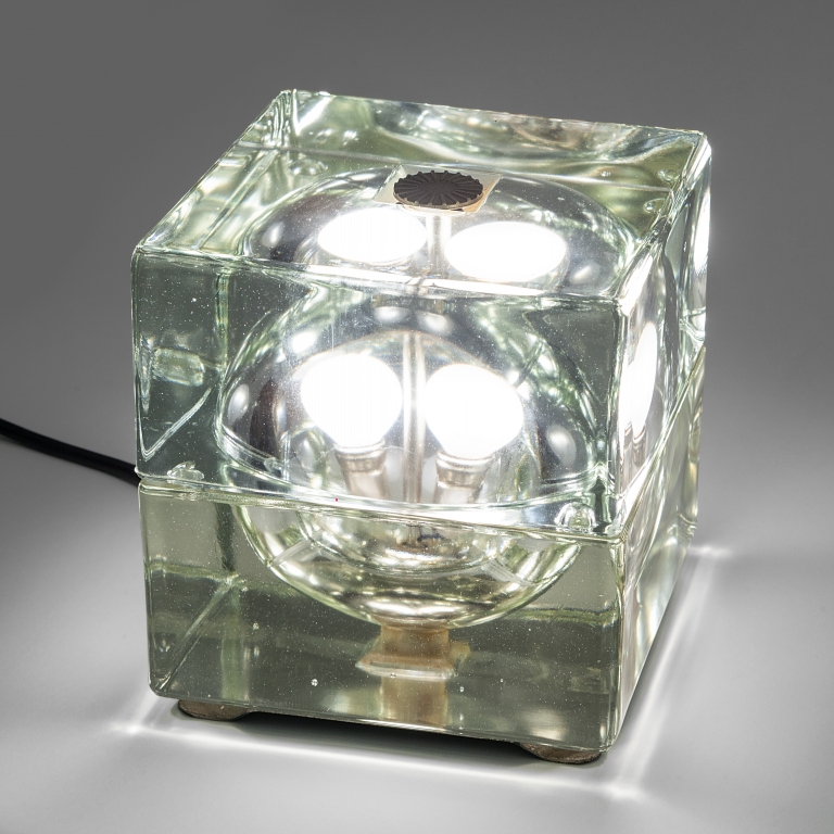 una lampada da tavolo "Cubosfera" per FIDENZA VETRARIA, 1968.