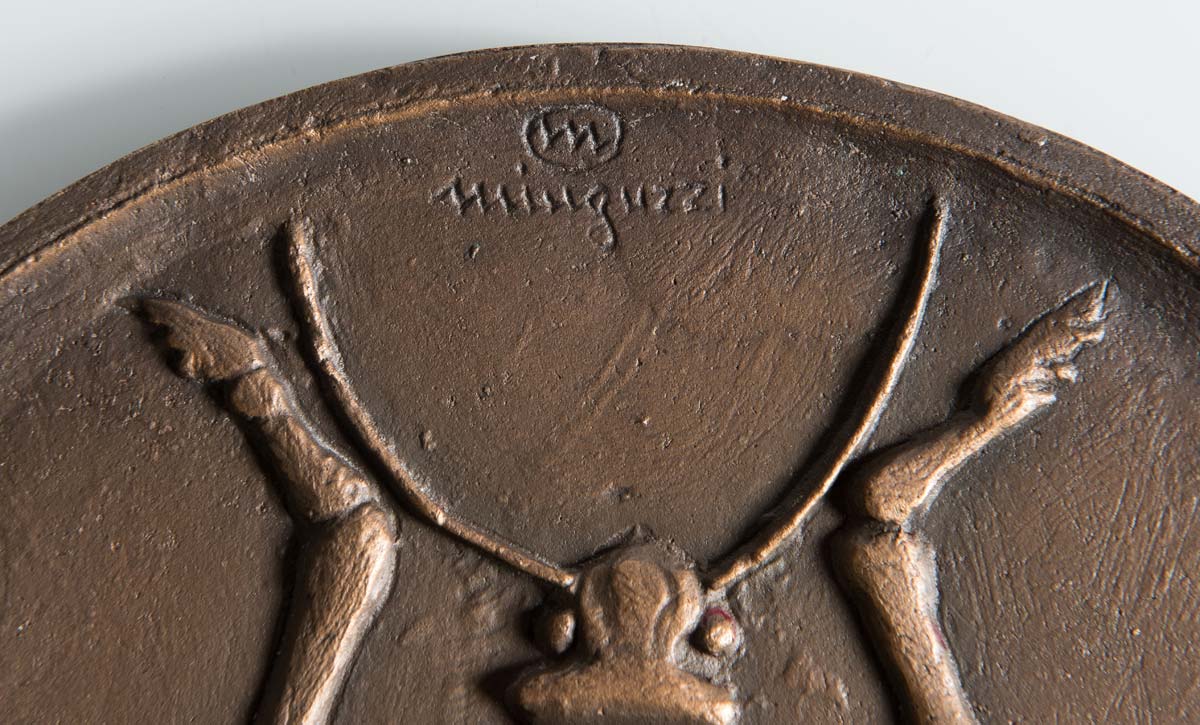 Luciano Minguzzi (1911 - 2004), “Gallo-50 Lire” e “Insetto-2 Lire”, Anni ‘70. Coppia di sculture in bronzo realizzate in occasione della produzione di una serie di monete della Lira per la Repubblica di San Marino, pezzi unici firmati Minguzzi, diametro Gallo cm 25.5 - Insetto cm 24.5