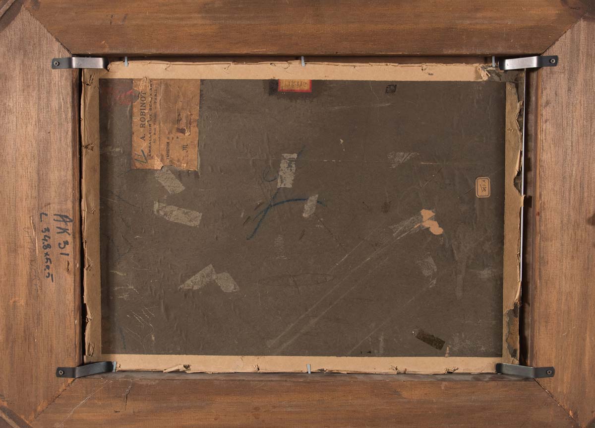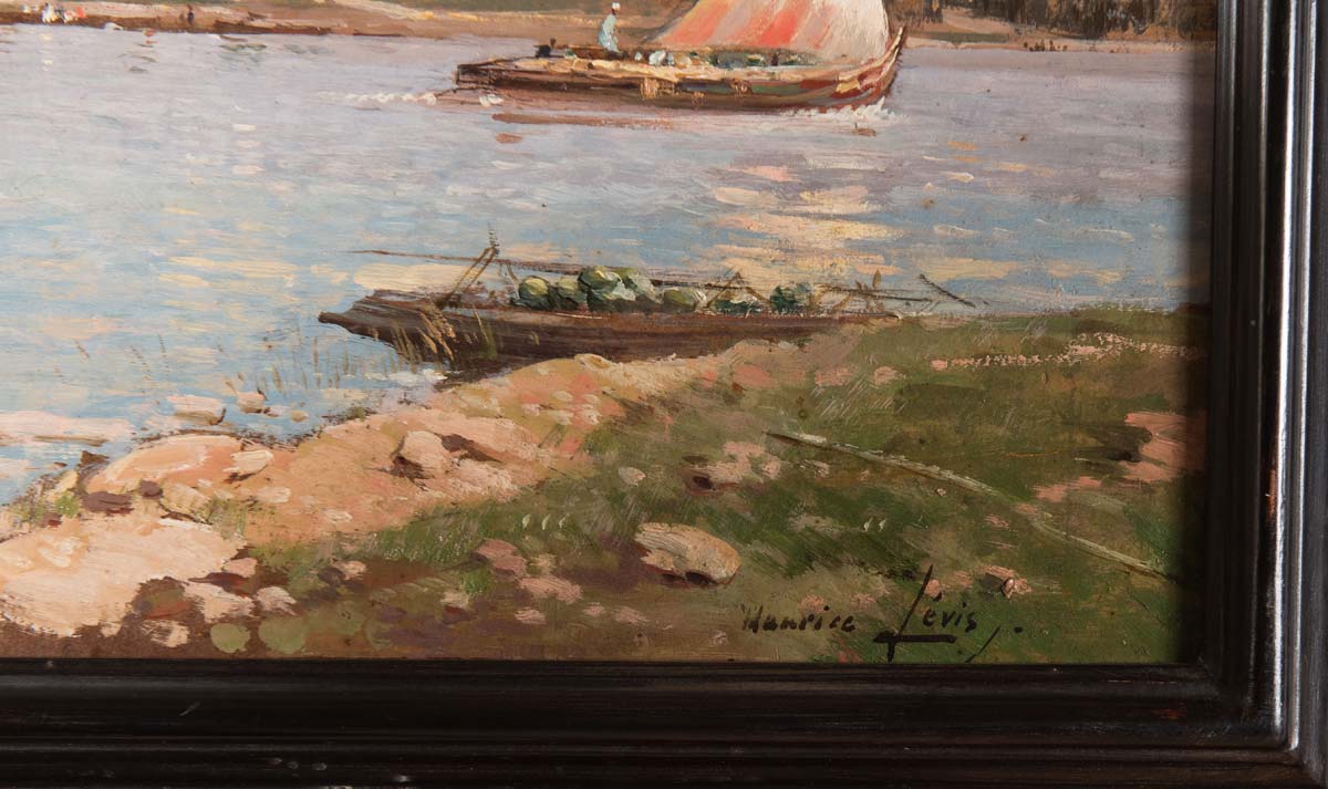 Maurice Levis (1860 - 1940), “La riva del Nilo Al Cairo”. Olio su tavola, firmato in basso a destra Maurice Levis, H cm 35x50 Al retro reca etichetta A. Robinot – Emballeur de Beaux-Art Paris