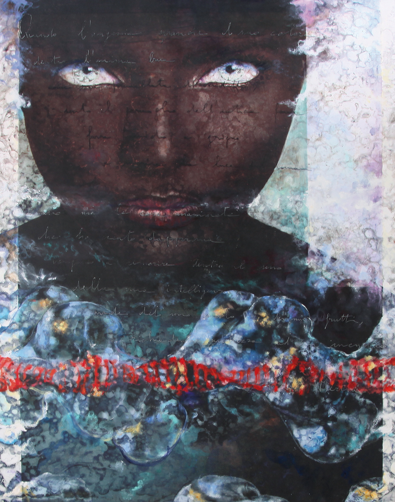 LAURA ORENI Vercelli 01/01/1961 Ascolta!, 2001 tecnica mista su tela cm. 100x80, firma, anno e certificato di garanzia ed autenticità dell'artista al retro, opera esposta nella mostra "Metamorfosi donna" a cura di Vincenzo Scardigno, tenutasi dal 3 al 8 marzo 2012 presso la Art Action, Palazzo Renzo Piano (NO).