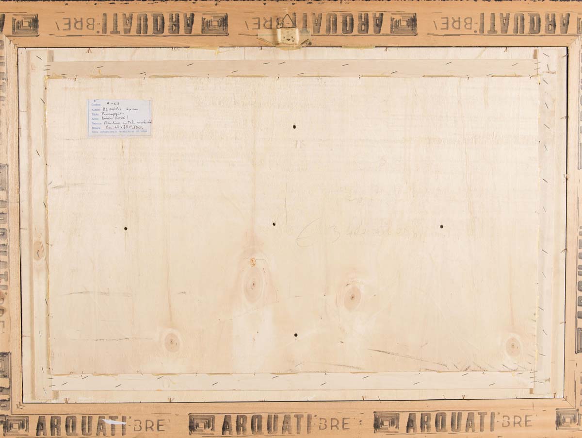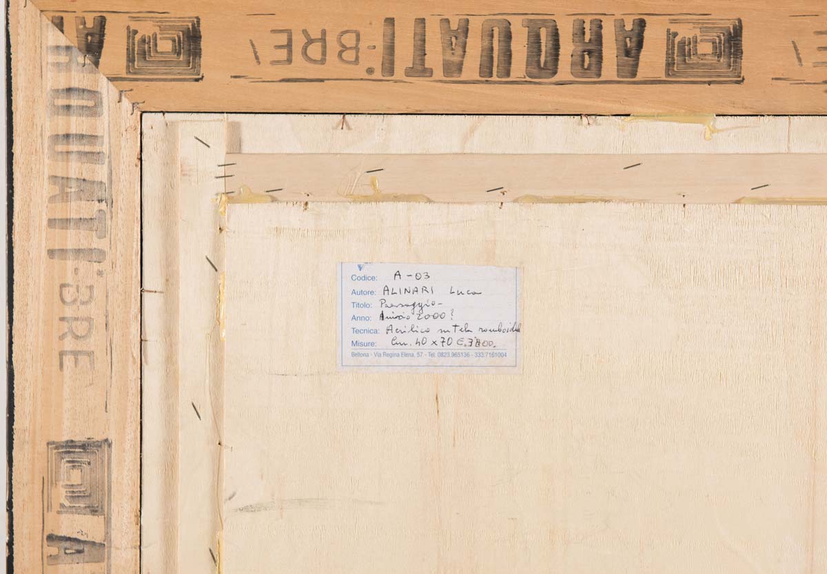 Luca Alinari (1943), “Paesaggio”. Acrilico su tela romboidale, firmato a destra Alinari, H cm 40x70 Reca al retro etichetta. Opera accompagnata da certificato di autenticità su fotografia dell’Artista