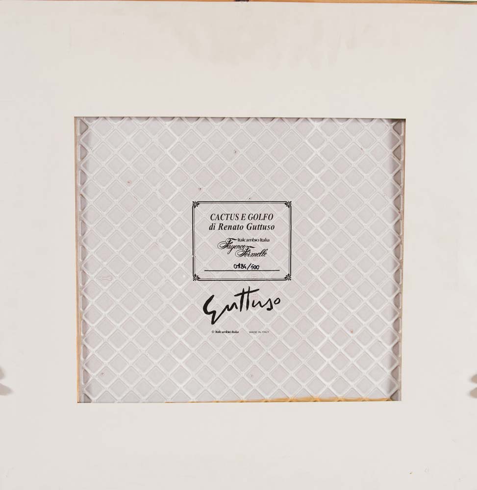 Renato Guttuso (1911 - 1987), “Cactus e Golfo”. Formella in ceramica, firmata in basso a destra Guttuso, al retro titolo, firma e numero di tiratura 184/500, H cm 35x39 Opera accompagnata da certificato di autenticità di Italcambio Italia, con firma di Fabio Carapezza Guttuso per autorizzazione