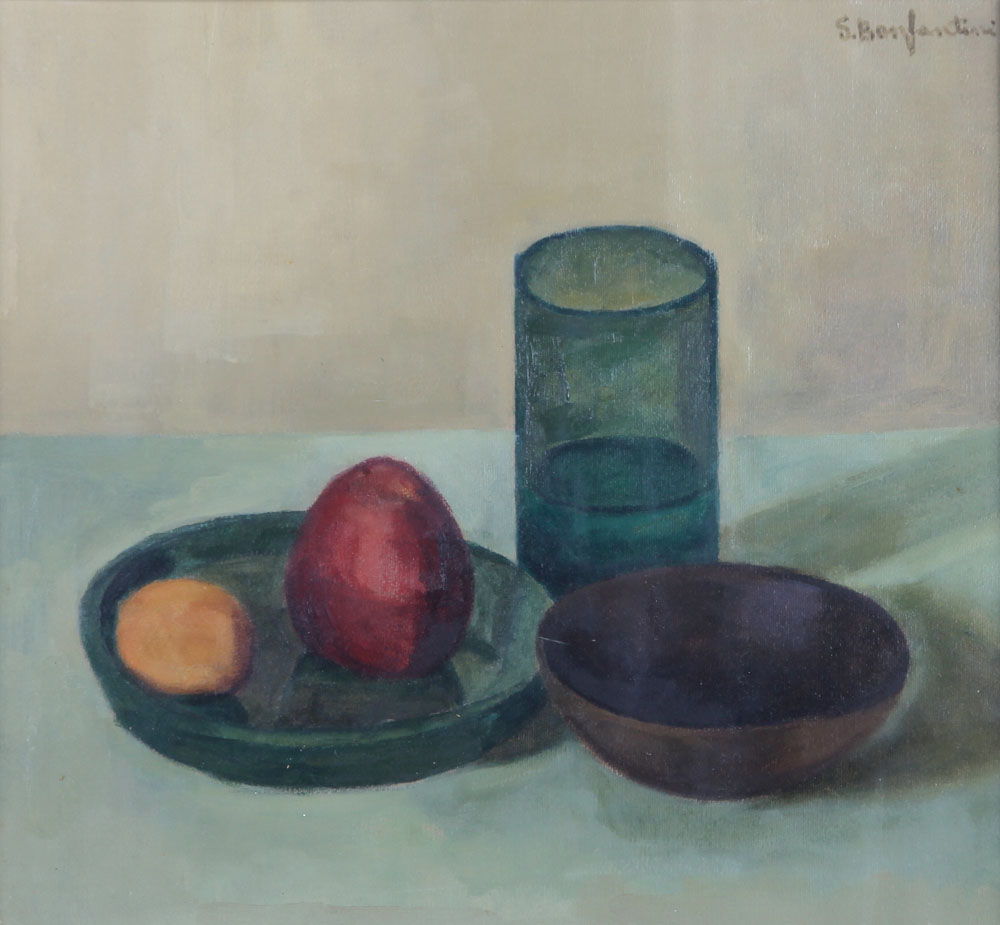 SERGIO BONFANTINI Novara 28/04/1910 - 22/01/1989 Bicchiere con ciotola marrone, 1964 olio su tavola cm. 40,5x43,5; firma in alto a destra, firma, titolo e anno al retro.