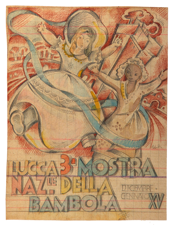 Uberto BONETTI (Viareggio 1909 - 1993 ) Bozzetto per pubblicità 1936 tecnica mista su cartoncino cm. 23 x 17.5Sigla "U.B." (a destra) Autentica a cura delle figlie Adriana e Maria Elda Bonetti, con n. di archivio 840