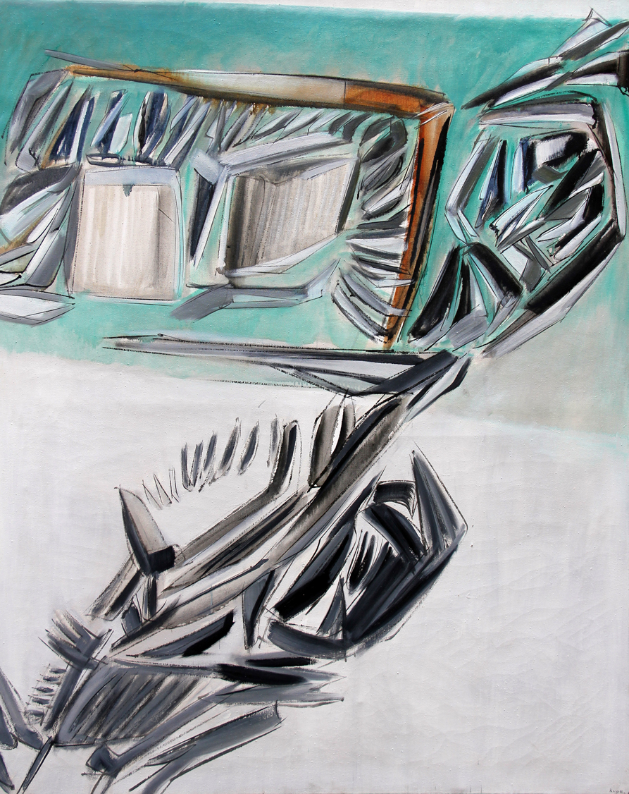 Mario ROSSELLO (Savona 1927 Savona 2000 ) Il grande viaggio 1961 olio su tela cm. 162 x 130Firma, data "Rossello, 61" (in basso a destra); Firma, data, dedica "Rossello, 61"; etichetta della XII premio Lissone, 1961; etichetta Galleria d'Arte del Naviglio, Milano (al retro)