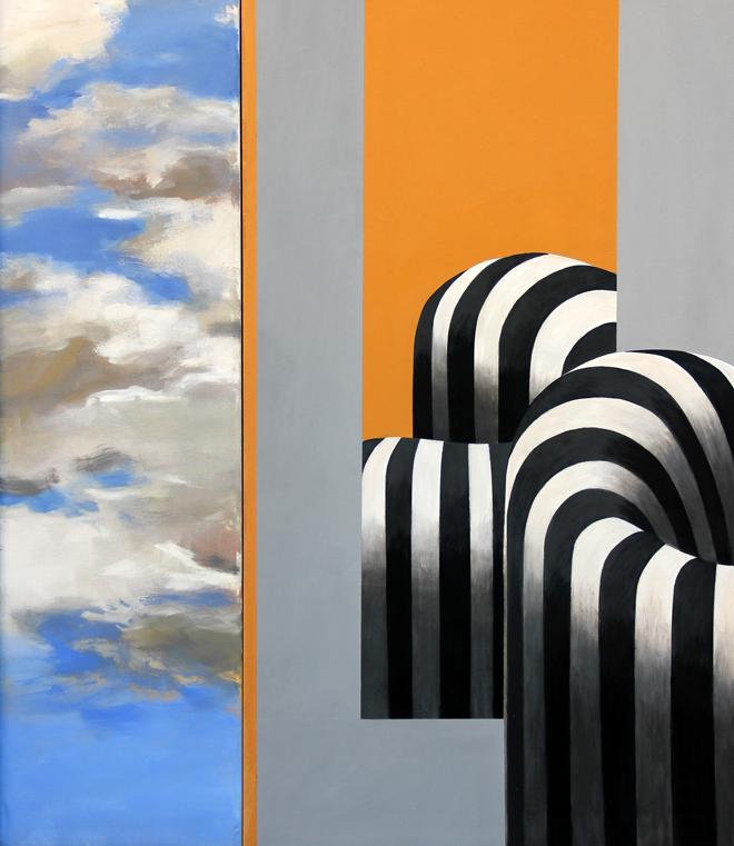 Gianfranco GOBERTI (Ferrara, 1939 ) Poltrona, riflesso e cielo 2016 olio su tela cm. 101.5 x 90Firma, titolo, anno "Goberti, Poltrona, riflesso e cielo, 2016" (al retro)