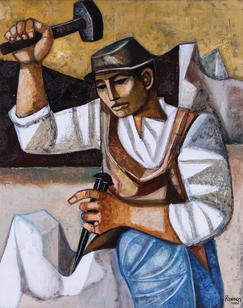 LUCIO RANUCCI Perledo (Co) 1924 Lo scalpellino, 2000 olio su tela cm. 50x40, firma e anno in basso a destra, titolo, firma, anno, archivio e timbro della Galleria Angolare al retro, timbro della Galleria Angolare , dichiarazione d'autenticità e archivio dell'artista su foto, certificato di autenticità della Galleria Family Club (Santhià-VC) allegato.