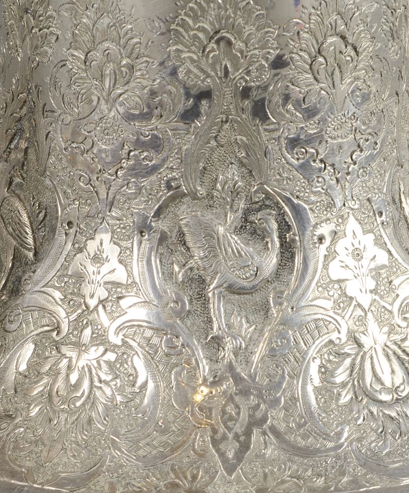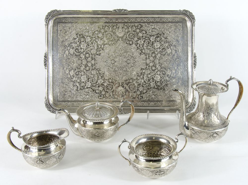 Servizio da caffè e thè in argento finemente inciso a motivi floreali e figure di animali, manici parzialmente in legno, composto da 5 pezzi. Punzioni Persia, inizio XX secolo. Gr. tot 3670.