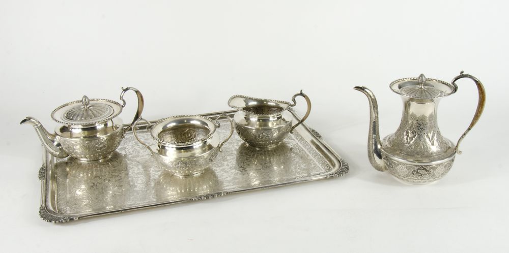 Servizio da caffè e thè in argento finemente inciso a motivi floreali e...