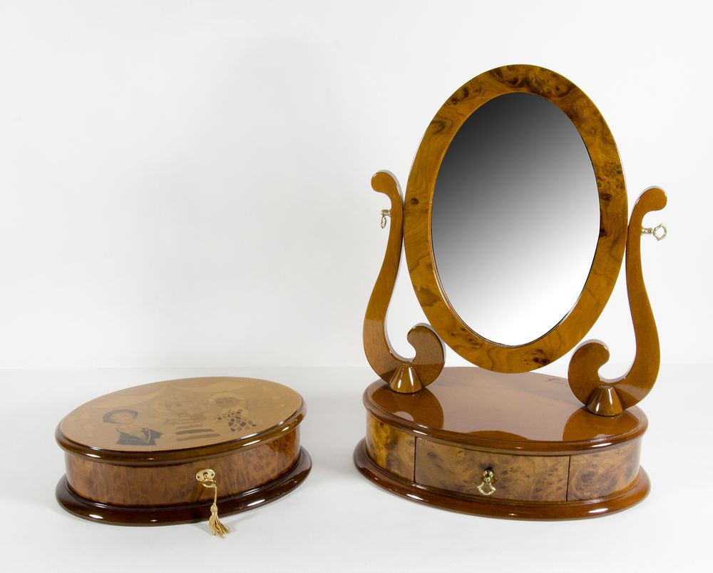 Lotto composto da scatoletta ovale portagioie e toilette da tavolo con specchio.