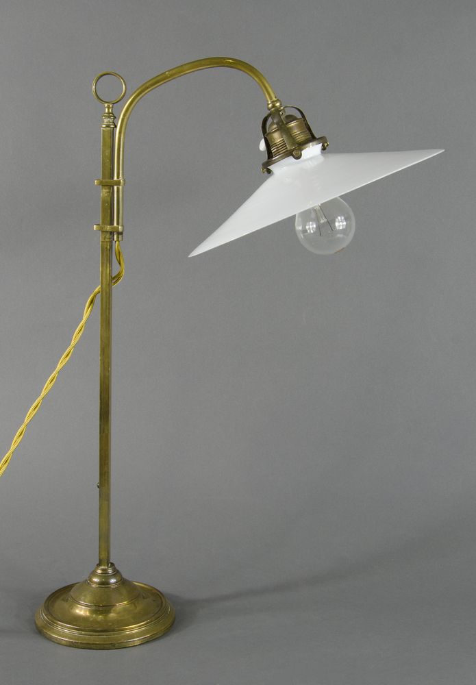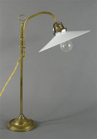 Lampada da tavolo regolabile in ottone con paralume in vetro opaco. H. cm. 54.