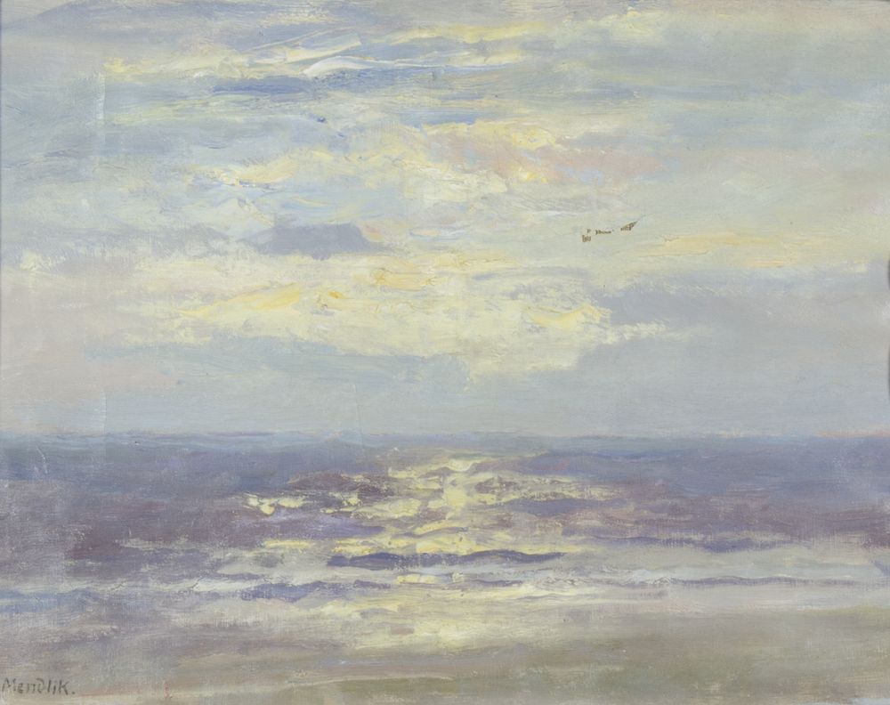 Oscar Mendlick 1871-1963 "Marina al tramonto" cm. 38x48 - olio su tela (difetti) Firmato b. a s.