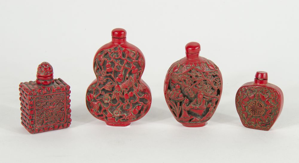 Lotto di 4 bottiglie in lacca incise con animali e scene di vita.