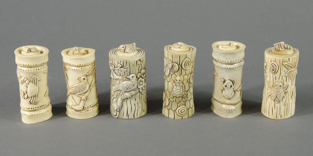 Lotto di 6 snuff bottles in osso a canna di bambù con figure di animali. XX secolo.