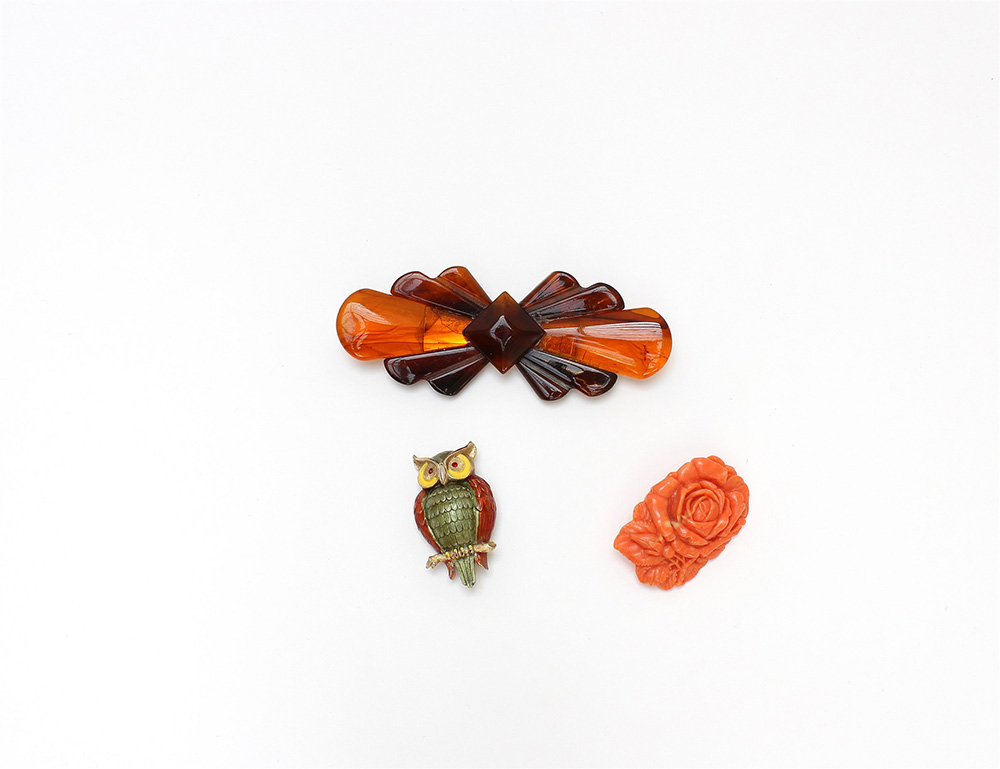 Lotto di tre spille di vari materiali, colori e soggetti (difetti)