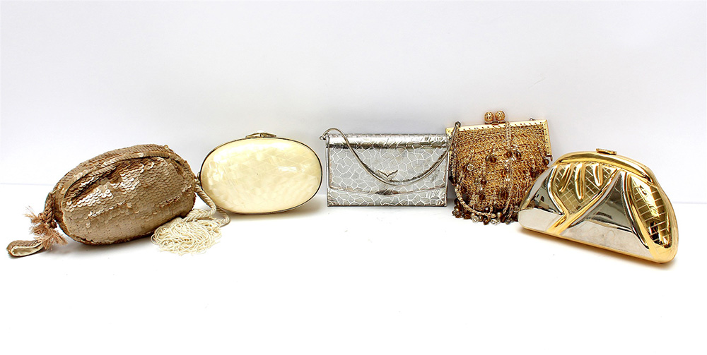 Lotto di cinque borsette da sera in diversi materiali e modelli nei toni dall'argento all'oro (difetti e segni d'uso)