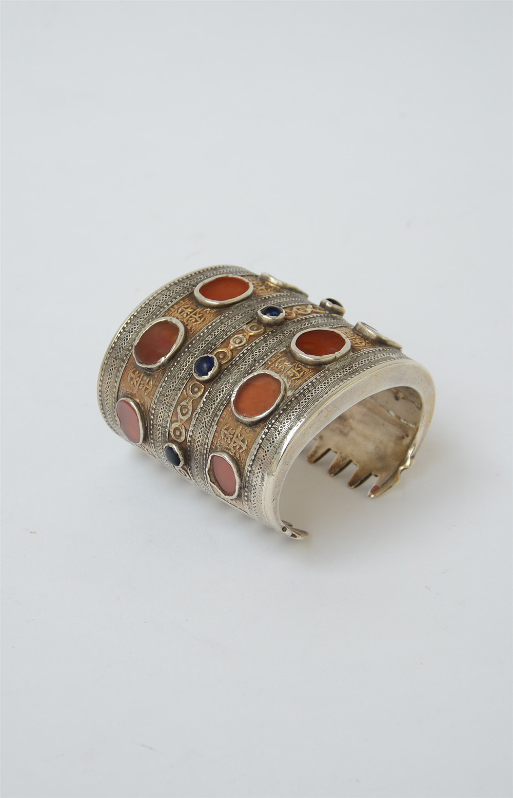Bracciale orientale "alla schiava" in argento, argento parzialmente dorato e petre dure gr. 270 ca. (cm 8x7.5 ca. ) (lievi difetti)