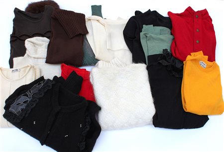 Lotto di numeriose maglie, maglioni e top di vari materiali, colori e modelli, alcuni in cashemere (misure varie) (difetti e segni d'uso)