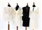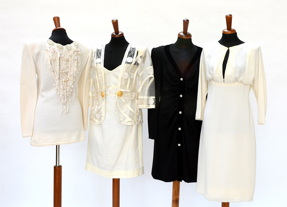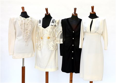Lotto di due vestiti, un abito con giacca e una maglia, in tessuti vari nei toni del bianco e nero, con decorazioni in strass, tessuto e bottoni gioiello (taglie varie) (difetti e segni d'uso)