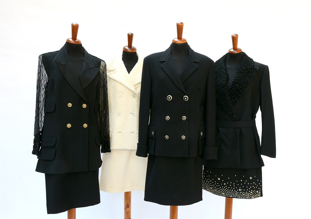 Lotto di quattro tailleurs di cui uno con cintura, uno sui toni dell'avorio e tre del nero, uno rifinito in astrakan, tutti con bottoni gioiello (tg. 42/44) (lievi segni d'uso)