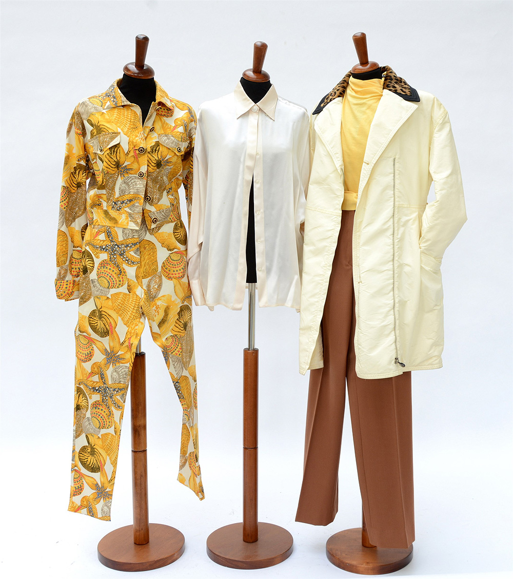 Lotto composto da giaccone, completo, giacchino e pantalone, due tra maglie e camicie e un pantalone sui toni del crème, giallo e bruciato (taglie varie) (difetti e segni d'uso)