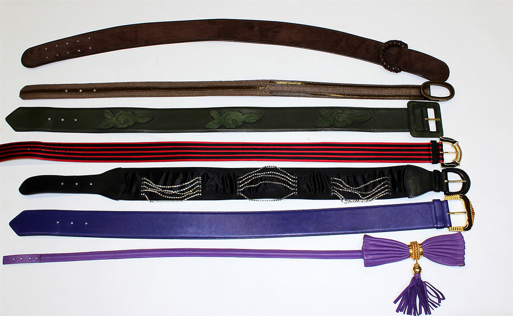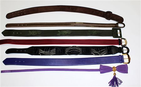 Lotto di sette cinture di forme, materiali, dimensioni e colori differenti