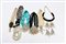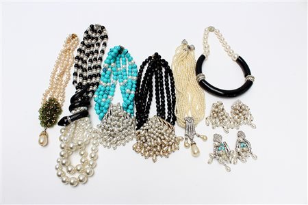 Lotto composto da una demi-parure, collier con orecchini in imitazione turchese, cinque colliers ed un paio di orecchini, tutto il materiale color nichel, perle fancy, strass e altri materiali (difetti e mancanze)