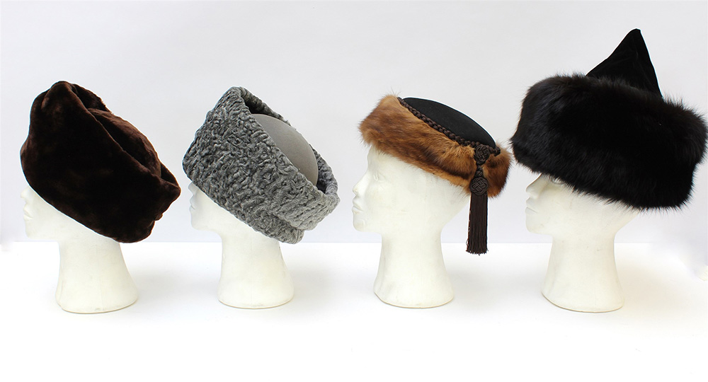 Lotto di quattro cappelli di forme, dimensioni differenti tutti rifiniti in pelliccia, sui toni del nero, grigio, marrone