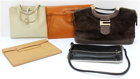 Lotto composto da quattro borse a busta e una borsa a mano di varie dimensioni, colori, modelli e materiali (difetti, segni d'uso)