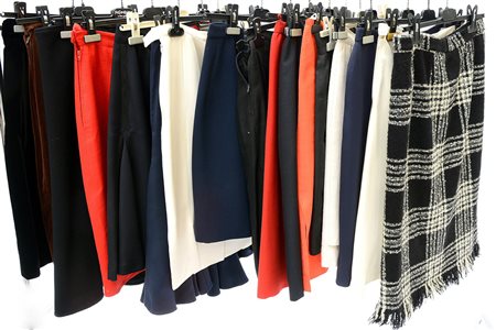 Lotto di diciasette gonne di varie fogge, colori e materiali (taglie varie) (difetti e segni d'uso)