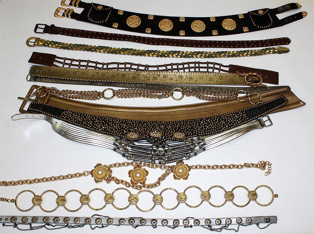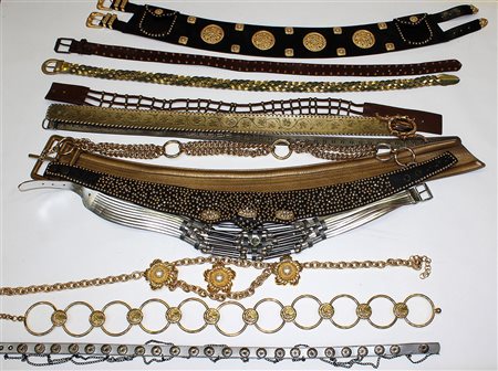 Lotto di quindici cinture in tessuto e metallo, dimensioni e forme diverse. Colori sui toni dell'oro e dell'argento (difetti)