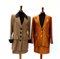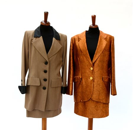 Lotto composto da due tailleurs, uno in gabardine color tabacco e l'altro in tessuto damascato color mordoré con bottoni gioiello (tg. 40) (lievi segni d'uso)
