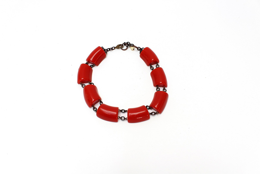 collana in metallo brunito e mezzi barilotti in simil corallo