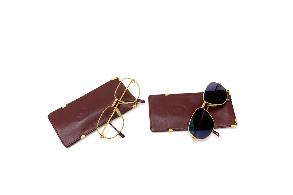 CARTIERLotto di due montature di occhiali placcate oro in astuccio originale.